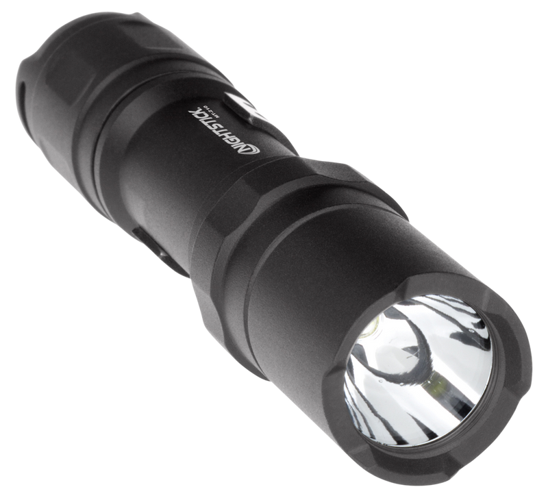 The Nightstick MT210 Mini-TAC Pro is a compact tactical flashlight with three user-selectable brightness levels (50/80/150 lumens) and a disorienting strobe mode. Constructed from aircraft-grade 6061-T6 aluminum with Type III hard anodized finish, it features a waterproof design (IPX-7 rated) and tail cap switch for momentary or constant-on operation. Powered by a single AA battery with an included removable pocket clip, this light delivers 105 meters of throw distance.