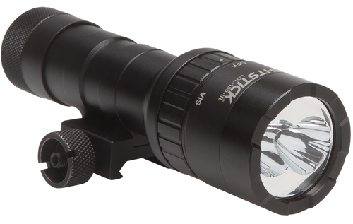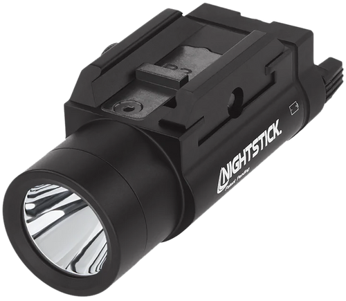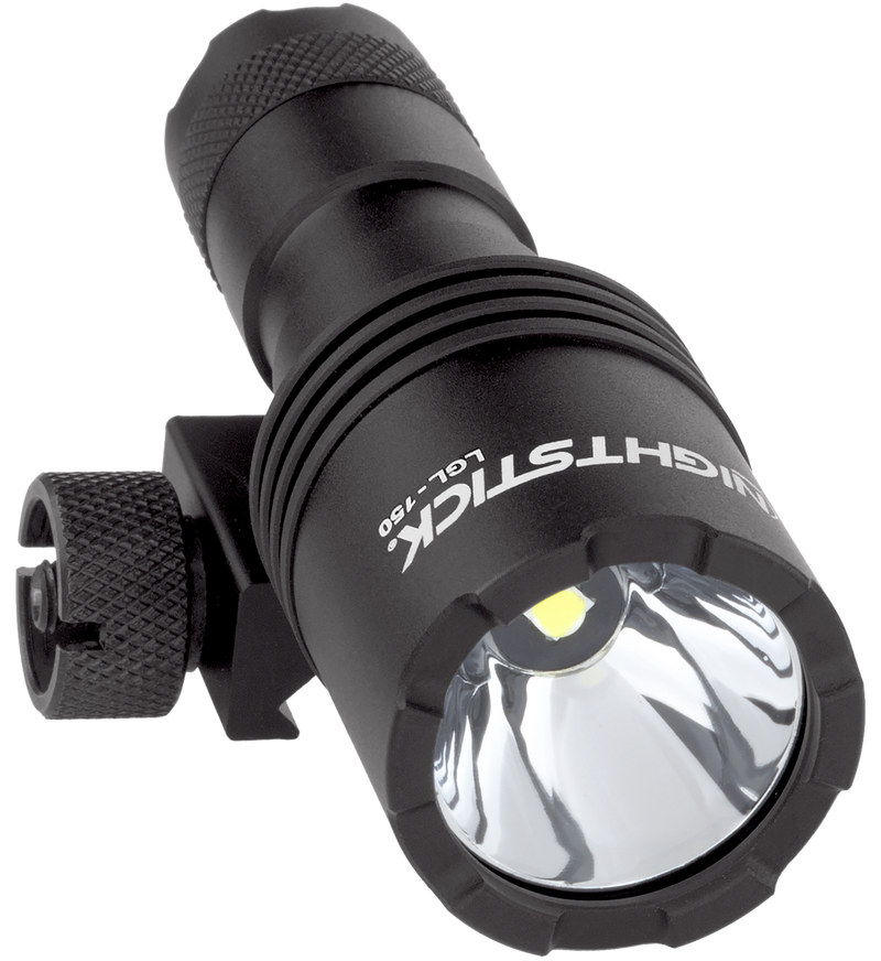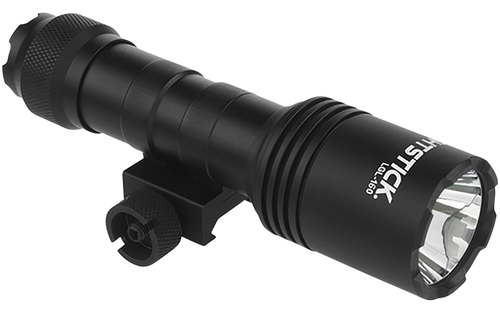 The Nightstick LGL150 is a 450-lumen LED weapon light designed for rifle and carbine platforms, featuring both tail cap and remote pressure switch options for momentary or constant-on operation. It includes standard and offset Picatinny rail mounts, delivers a focused 220-meter beam, and is housed in aircraft-grade aluminum with Type III hard-anodized finish. The light is IPX7 waterproof, runs on CR123 batteries for approximately 2 hours, and weighs 4.2 ounces.