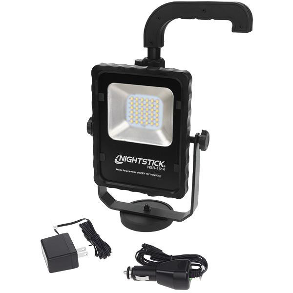 The NSR-1514C is a portable rechargeable LED area light delivering 1000 lumens on high and 500 lumens on low with a single push-button switch. Constructed from lightweight 6061-T6 aluminum with a multi-fin heat sink design, it features a swivel mount with heavy-duty magnetic base for flexible positioning. Rated IP67 waterproof with a 4 or 8-hour runtime on a single rechargeable lithium battery.