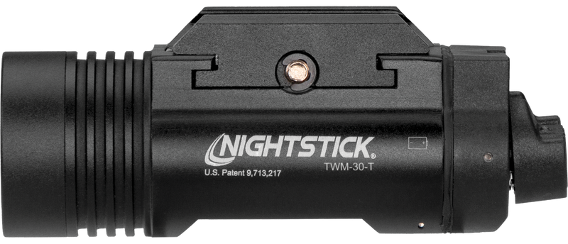 The Nightstick TWM30T is a tactical weapon-mounted light delivering 1200 lumens with a white LED and 66,000 candela output for tactical illumination. It features a black anodized hardcoat finish, waterproof construction, and operates on two CR123 batteries with manual push-button activation. The compact 3.5" design makes it suitable for handguns and other tactical firearms.