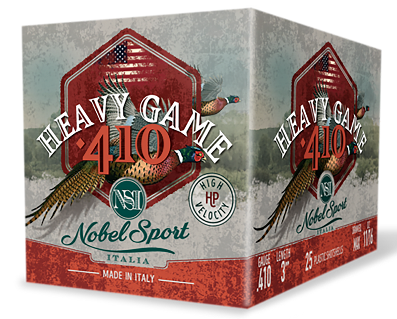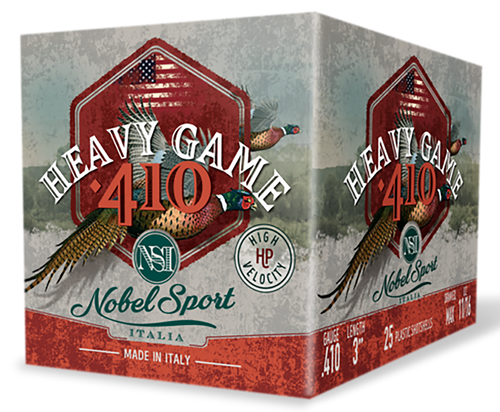 Nobel Sport 410 gauge 3" shotshells loaded with 11/16 oz of #9 lead shot at 1145 fps velocity. These hunting shotshells are assembled to high quality standards using plastic cases and are designed for game hunting applications.