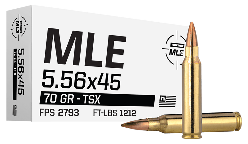 Norma Bondstrike 5.56mm centerfire rifle ammunition features a 70 grain bullet with a muzzle velocity of 2793 fps and muzzle energy of 1212 ft lbs. Each box contains 20 rounds of brass-cased ammunition suitable for AR-15s and other 5.56 NATO rifles.