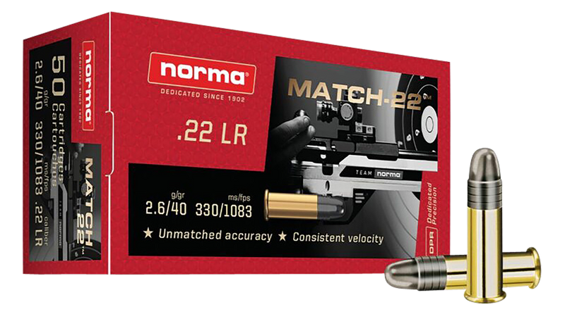 Norma Dedicated Precision Match ammunition in .22 LR features a 40-grain lead round nose bullet with a muzzle velocity of 1083 fps and 105 ft-lbs of energy. The brass-cased, reloadable rounds are designed for precision target shooting and competitive match use, delivering consistent accuracy at range.