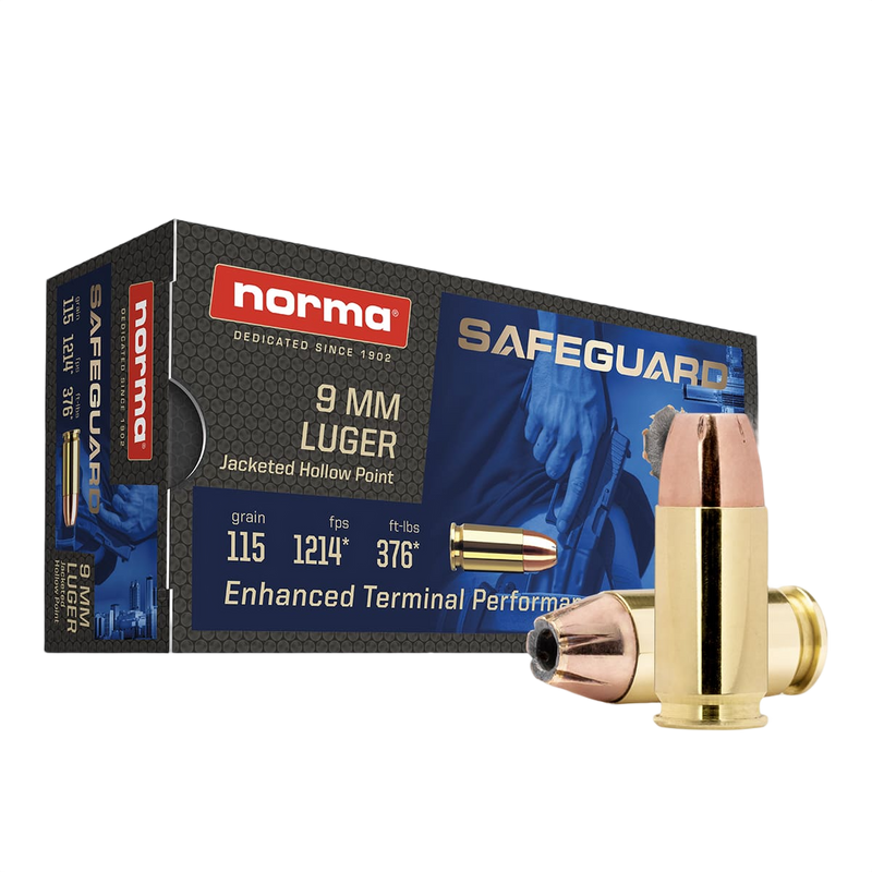 Norma Safeguard 9mm Luger ammunition features 115 grain jacketed hollow point bullets loaded to 1214 fps muzzle velocity with 376 ft-lbs of energy. The rounds use quality Norma brass cases with Boxer primers and are designed for reliable expansion and penetration in self-defense applications.