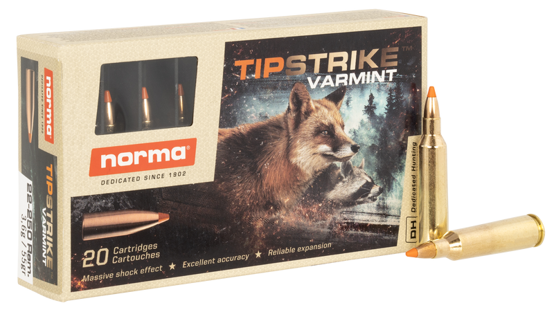 Norma TipStrike Varmint ammunition in .22-250 Rem features a 55-grain polymer-tipped bullet delivering 3576 fps muzzle velocity and 1534 ft-lbs of energy. Designed for varmint hunting with rapid expansion and superior accuracy, this ammunition comes in 20-round boxes with reloadable brass cases and Boxer primers.