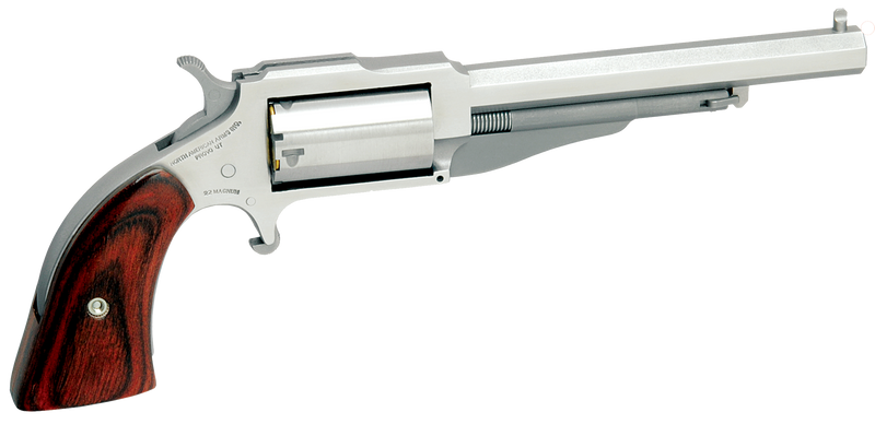 Single-action revolver chambered in 22 WMR with a 4" stainless steel octagonal barrel and 5-round capacity. Features exposed hammer, post front sight, rosewood boot grip, and weighs 8.90 oz. The faux loading lever design mimics 150-year-old percussion revolvers while serving as a practical cylinder pin lock.