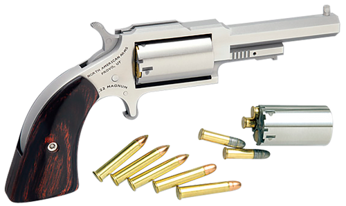Single-action mini-revolver chambered in 22 LR/22 Magnum with a 6" stainless steel barrel and 5-shot capacity. Features an exposed hammer, fixed post front sights, and rosewood boot grips. Weighs 9.7 oz with an overall length of 9.75", making it a compact option for personal protection or sport shooting.