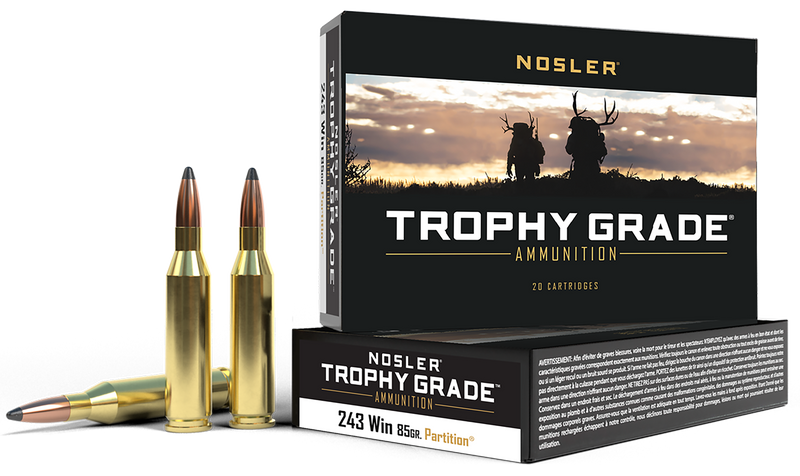 Nosler Trophy Grade ammunition in .243 Winchester with 85-grain Nosler Spitzer Partition bullets. Delivers 3225 fps muzzle velocity and 1962 ft-lbs of energy, ideal for hunting and target shooting applications. Packaged 20 rounds per box with 10 boxes per case.