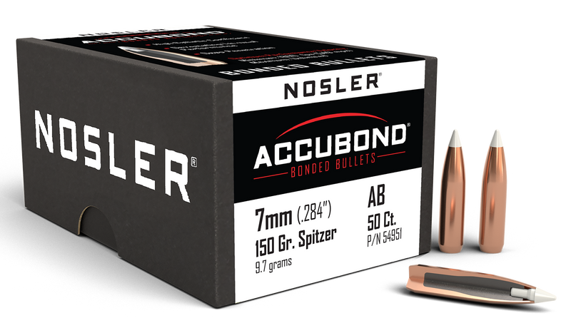 Nosler AccuBond bullets feature a proprietary bonding process that couples a copper-alloy jacket with a lead-alloy core, delivering deep penetration and consistent expansion on impact. The polymer tip resists deformation and aids accuracy, while the boat-tail base design provides a platform for large diameter mushrooms. Available in 7mm caliber (.284"), 150 grain weight, packaged 50 per box.
