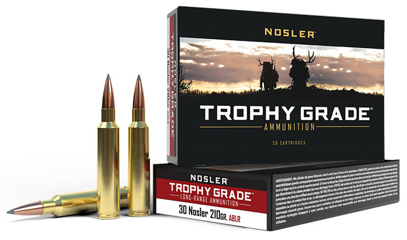Nosler Trophy Grade Long-Range ammunition in 30 Nosler caliber with 210-grain AccuBond Long Range bullets. Loaded to 3000 fps muzzle velocity with 4196 ft-lbs of energy, this ammunition features Nosler brass and is designed for long-range hunting applications.