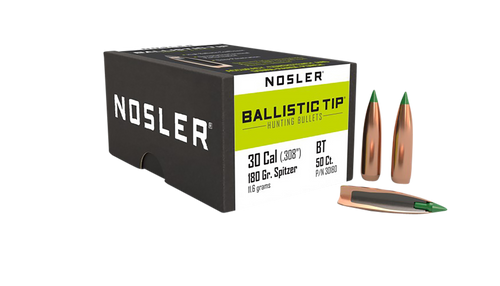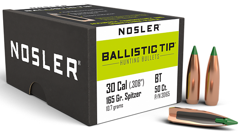 Nosler Ballistic Tip hunting bullets in .308 diameter, 165 grain weight, featuring a polymer tip for rapid expansion and a fully-tapered copper jacket for consistent energy transfer. Designed for rifle hunting applications with 50 rounds per box. These lead core, boat tail spitzer bullets deliver accuracy and reliable performance across practical hunting velocities.