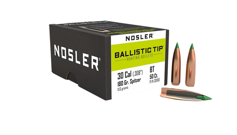 Nosler Ballistic Tip 30 Caliber 180 Grain Spitzer Boat Tail Reloading Bullets 50/Box - 30180