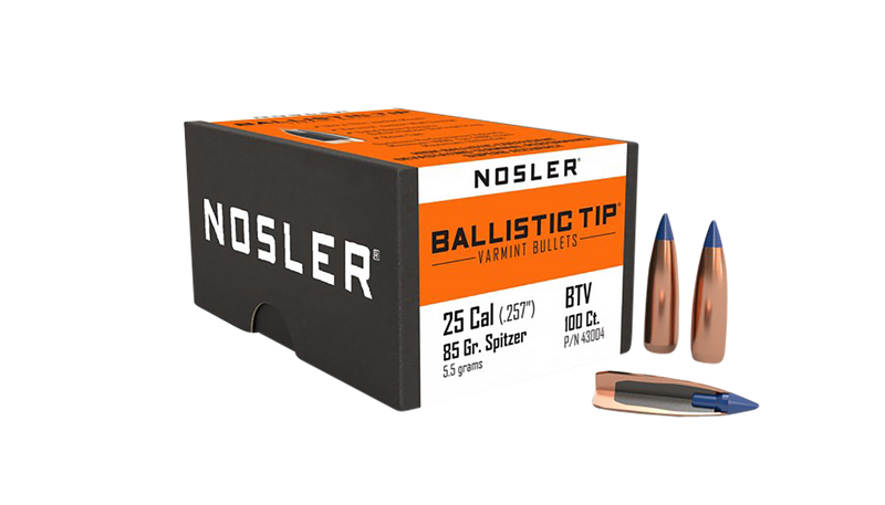 Nosler Ballistic Tip Varmint bullets in .257" diameter (25 caliber) with 85 grain weight, featuring a polymer tip and gradually thickening copper jacket for controlled expansion. Designed for high-velocity rifle loads with excellent aerodynamic performance. Box contains 100 bullets.