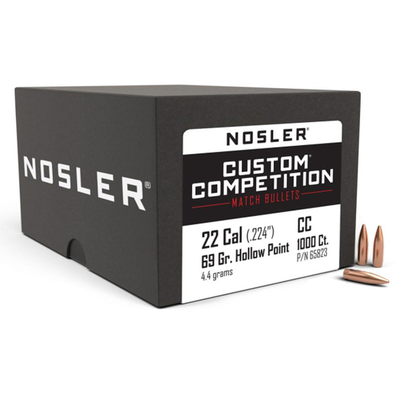 Nosler Custom Competition Bullets are precision rifle bullets designed for competitive shooting applications. These .22 caliber, 69 grain hollow point boat tail projectiles feature highly concentric jackets and a small meplat to reduce drag and improve aerodynamic efficiency. Sold in bulk quantities of 1000 rounds per box.
