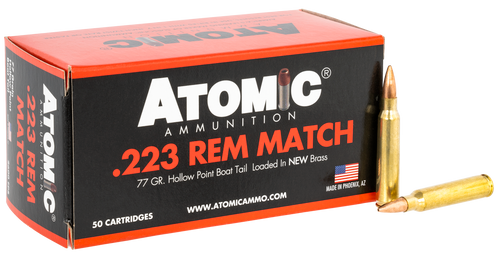 Nosler Match Grade ammunition in .223 Rem with 77gr Custom Competition hollow point boat tail bullets loaded to 2600 fps, delivering 1156 ft-lbs of muzzle energy. Features precisely neck-sized Nosler brass with checked flash holes, meticulously weighed powder charges, and visual inspection/polishing for match-grade accuracy. Ideal for target shooting and competition rifle applications.