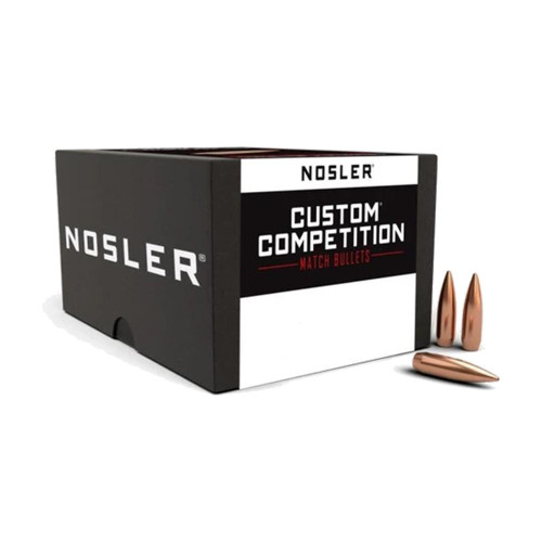 Nosler Custom Competition bullets designed for match rifle accuracy with hollow point design for reduced drag and boat-tail configuration for exceptional flight characteristics. These .308" diameter, 168 grain jacketed lead bullets are engineered for competition and precision shooting applications. Package contains 100 rounds and contains lead (California Prop 65 warning).