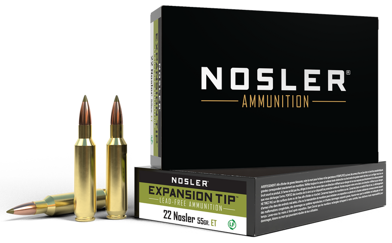 Nosler E-Tip ammunition in .22 Nosler caliber loaded with 55gr lead-free E-Tip bullets achieving 3500 fps muzzle velocity and 1496 ft-lbs energy. Premium brass cases with Boxer primers provide reliable performance meeting all lead-free hunting regulations, offering exceptional stopping power and penetration across a broad spectrum of impact velocities.