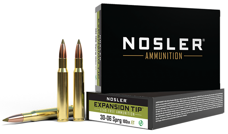 Nosler E-Tip ammunition in .30-06 Springfield with 180-grain lead-free E-Tip bullets loaded to 2750 fps with 3022 ft-lbs of muzzle energy. Premium brass cases deliver consistent performance while meeting all lead-free hunting regulations. Boat-tail spitzer design with polymer tip provides exceptional penetration and stopping power across a broad range of impact velocities.