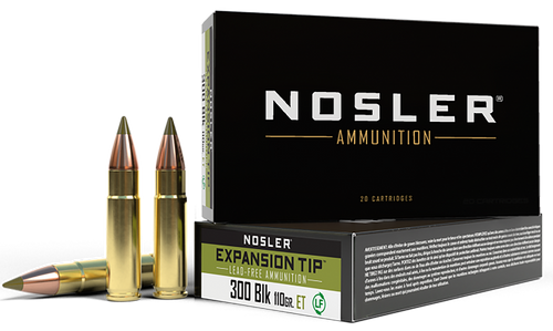 Nosler E-Tip ammunition in .300 Win Mag with 180-grain lead-free bullets loaded to 2950 fps and 3478 ft-lbs of muzzle energy. Features Nosler premium brass cases and a streamlined polymer-tip design for exceptional penetration and stopping power across a broad range of impact velocities. Meets all lead-free hunting regulations.