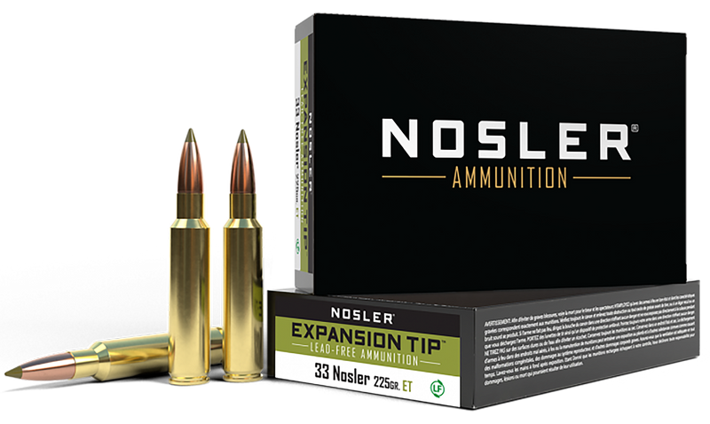 Nosler E-Tip ammunition in 33 Nosler caliber loaded with 225gr lead-free E-Tip bullets achieving 2975 fps muzzle velocity and 4437 ft-lbs of energy. Features Nosler premium brass cases and a boat-tail design with streamlined polymer tip for exceptional penetration and stopping power. Complies with all lead-free hunting regulations.