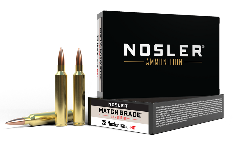 Nosler Match Grade ammunition chambered in 28 Nosler with 168gr Custom Competition hollow point boat tail bullets, loaded to 3075 fps with 3541 ft-lbs of muzzle energy. Features Nosler premium brass cases and is designed for precision target shooting applications. Each box contains 20 rounds; sold in cases of 10 boxes.