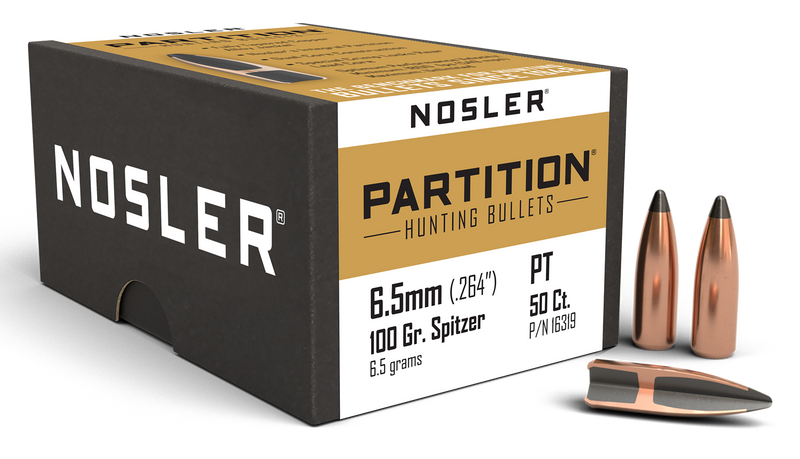 Nosler Partition bullets feature a dual-core design with a fully tapered copper-alloy jacket that ruptures on impact while an integral partition supports the expanded mushroom and retains the rear core for deep penetration. These .264" diameter, 100-grain spitzer bullets are designed for hunting rifles in 6.5 Creedmoor and similar cartridges, with 50 bullets per box. The Partition is a lead-core, jacketed bullet with a sectional density of .205 and has been the benchmark for hunting since 1948.