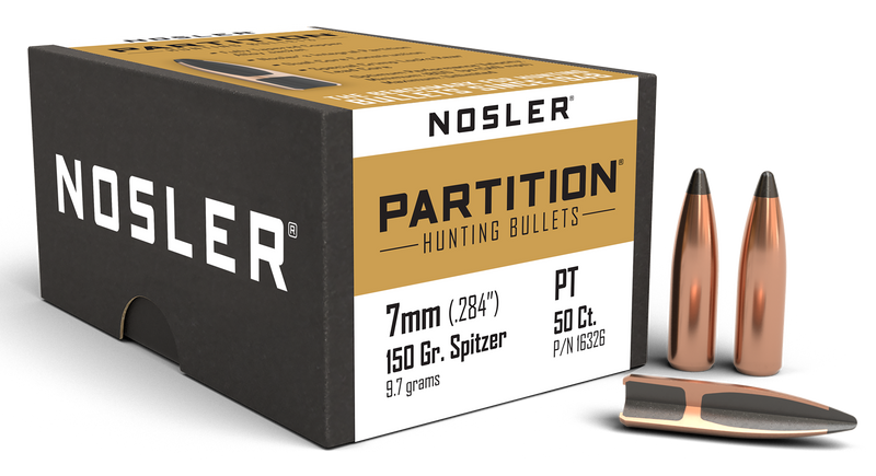 The Nosler Partition is a time-tested hunting bullet featuring a dual-core design with a copper-alloy jacket that expands on impact while an integral partition keeps the rear core intact for deep penetration. This 7mm .284" 150 grain spitzer bullet comes in boxes of 50 and is designed for rifle reloading applications. The .266 sectional density and lead core construction make it suitable for medium to large game hunting.
