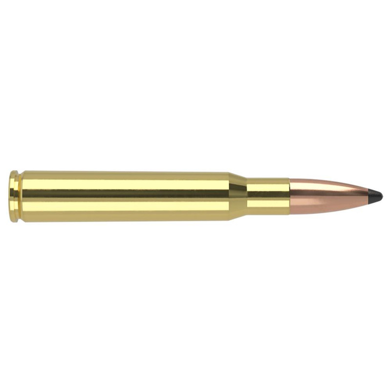 Nosler Trophy Grade ammunition loaded with 180-grain Partition bullets at 2750 fps, delivering 3022 ft-lbs of energy. Features Nosler Premium Boxer-primed brass cases and the dual-core Partition bullet design for controlled expansion and retained weight. Packaged in 20-round boxes with reloadable brass cases.