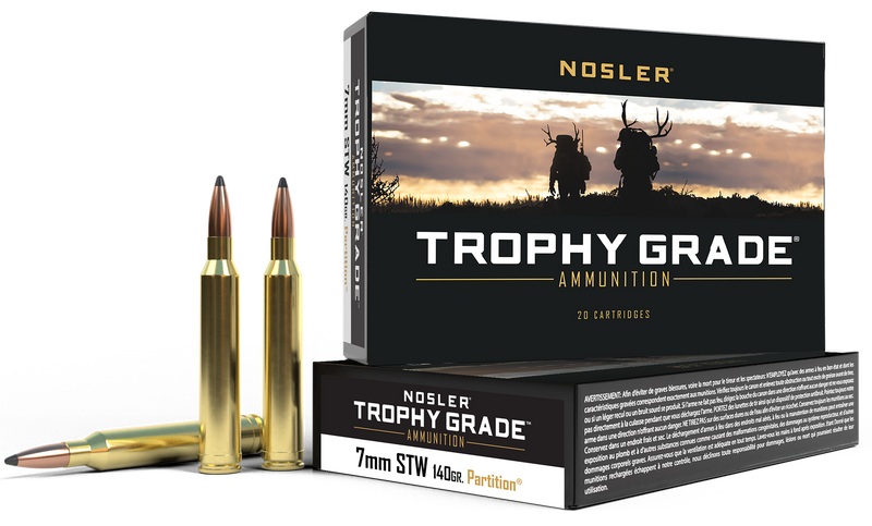 Nosler Trophy Grade ammunition loaded with 140-grain Nosler Spitzer Partition bullets in 7mm STW caliber, delivering 3,300 fps muzzle velocity and 3,384 ft-lbs of energy. Features Nosler Premium brass cases and the iconic Partition bullet design with dual-core construction for controlled expansion and deep penetration. Packaged 20 rounds per box, 10 boxes per case.