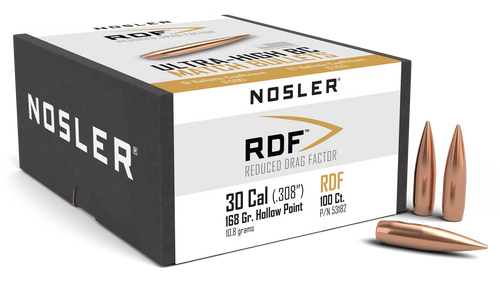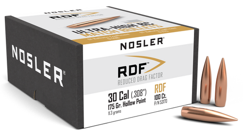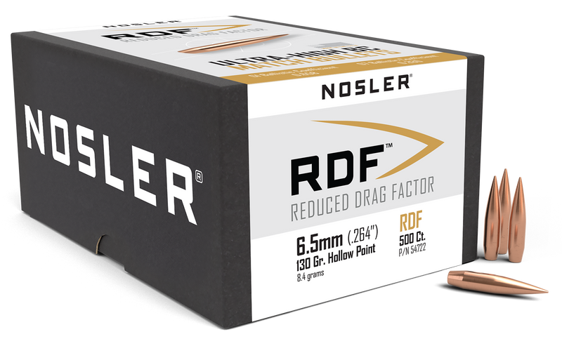 Nosler RDF Match bullets are designed for precision rifle reloading, featuring an optimized compound ogive and drag-reducing boat-tail to deliver flat trajectories and minimal wind drift. Each box contains 500 bullets with a .264" diameter and 130 grain weight, ideal for 6.5 Creedmoor handloads. The jacketed lead construction with consistent hollow point meplats ensures reliable performance for match-grade ammunition.