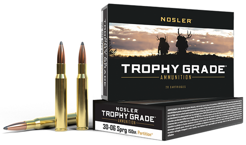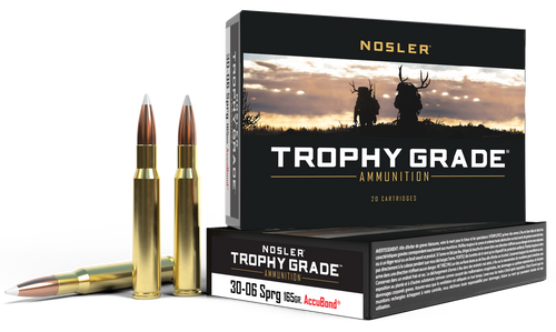 Nosler Trophy Grade ammunition in 30-06 Springfield with 180gr AccuBond bullets, delivering 2750 fps muzzle velocity and 3022 ft-lbs of energy. Loaded with premium Nosler brass and featuring AccuBond's white polymer tip for accuracy and reliable expansion. Designed for hunting and target applications with consistent performance across all conditions.