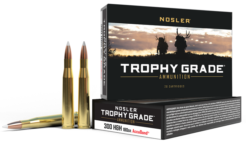 Nosler Trophy Grade centerfire rifle ammunition in .300 H&H Magnum with 180-grain AccuBond bullets, delivering 2950 fps muzzle velocity and 3477 ft-lbs muzzle energy. Loaded with Nosler Custom brass and Nosler bullets for optimum hunting performance. Box of 20 rounds.