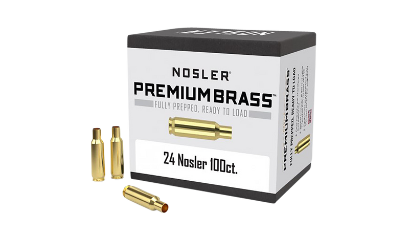 Nosler Premium Brass cartridge cases are fully prepped and ready for reloading, with each piece chamfered, deburred, checked for proper alignment, sized, and trimmed to proper length. Hand-inspected to ensure exact dimensional standards and tolerances for maximum accuracy and consistency. Sold in boxes of 100 unprimed cases designed for the 24 Nosler rifle cartridge.
