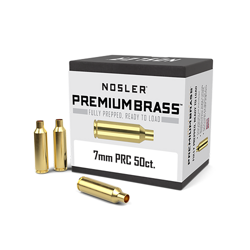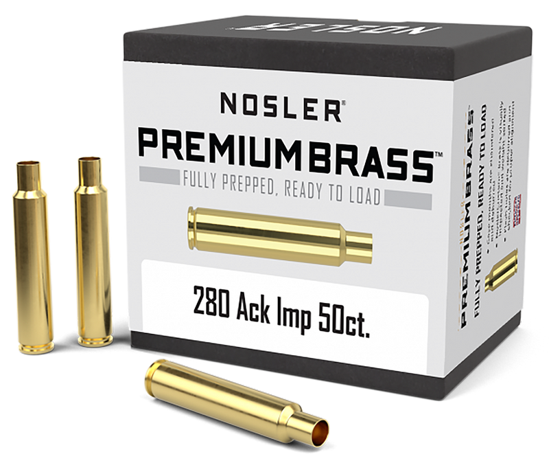 Nosler Premium Brass unprimed cases for .280 Ackley Improved rifles, sold in boxes of 50. Cases are fully prepped with chamfering, deburring, proper alignment, and trimmed to specification, then hand-inspected to ensure dimensional standards and maximum accuracy consistency.