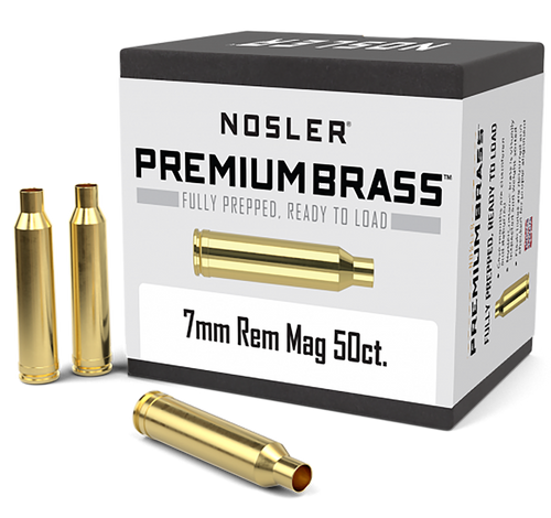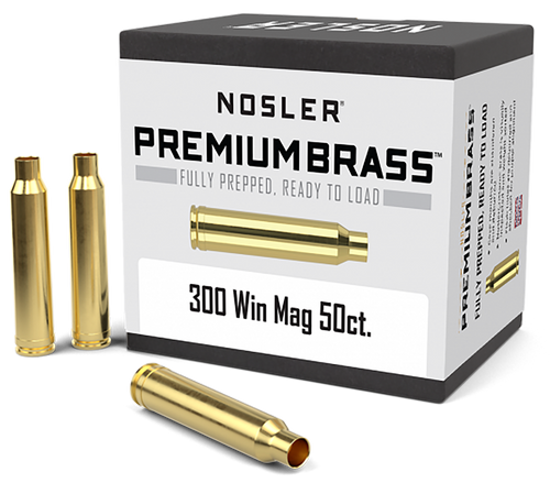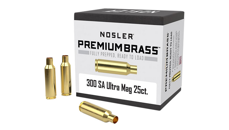 Nosler Premium Brass unprimed rifle cases for the .300 Remington SA Ultra Magnum cartridge, sold in boxes of 25. Each case is fully prepped with chamfering, deburring, and trimmed to proper length, then hand-inspected to meet exact dimensional standards for maximum accuracy and consistency.