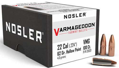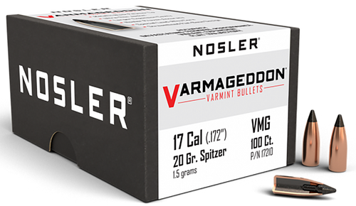 Nosler Varmageddon bullets are .17 caliber (0.172" diameter) varmint rounds featuring a 20-grain flat base hollow point design for bench-rest accuracy and violent expansion on impact. The lead-alloy core with copper-alloy jacket delivers high velocities and exceptional terminal performance on varmints at all practical ranges. This box contains 100 bullets.