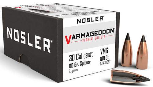 Nosler Varmageddon bullets in 22 caliber (.224 diameter) deliver 62 grains with a flat base hollow point design for varmint hunting applications. The lead-alloy core and copper-alloy jacket combination provides violent expansion on impact while maintaining bench-rest accuracy. Each box contains 100 bullets with a sectional density of 0.176 and ballistic coefficient of 0.251.