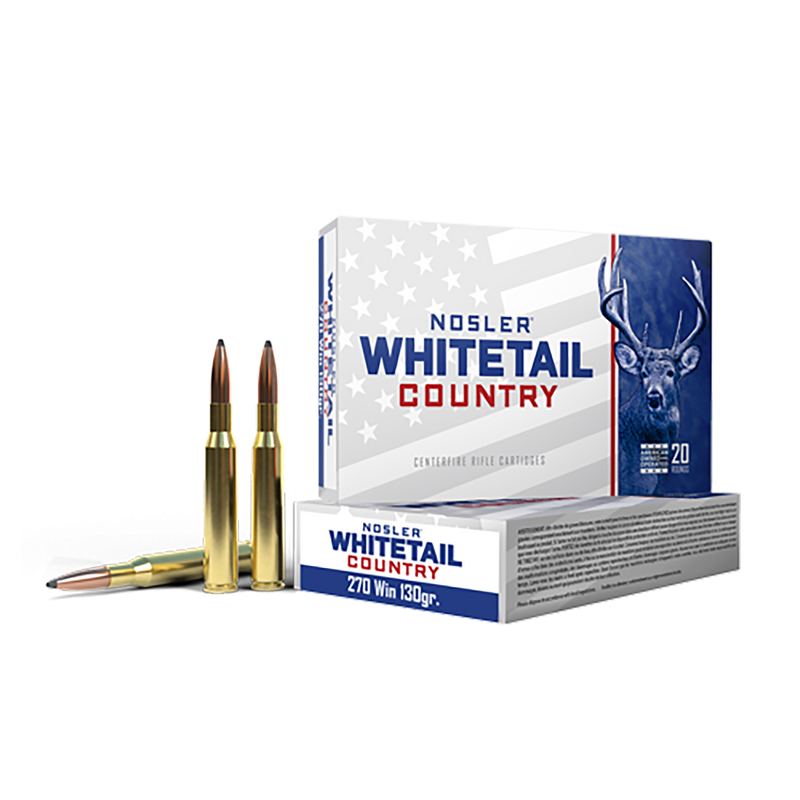 Nosler Whitetail Country ammunition in .270 Winchester with 130-grain Solid Base Soft Point bullets loaded to 3060 fps. Engineered specifically for deer hunting with a fifth-generation tapered jacket and heavy solid base for deep penetration and expansion. Features a boat-tail design for superior accuracy and wind resistance.