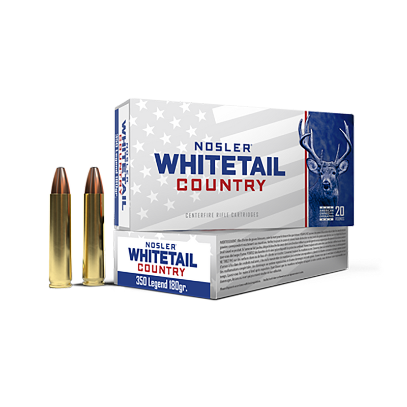Nosler Whitetail Country ammunition in 350 Legend with 180-grain straight-wall bullets designed for deer hunting at extended range. The flat-base thin-jacket design with lead nose provides reliable expansion at the slower velocities typical of straight-wall cartridges, with a muzzle velocity of 2100 fps and 1752 ft-lbs of energy. Each box contains 20 rounds with brass casing and truncated nose profile for smooth feeding in all action types.
