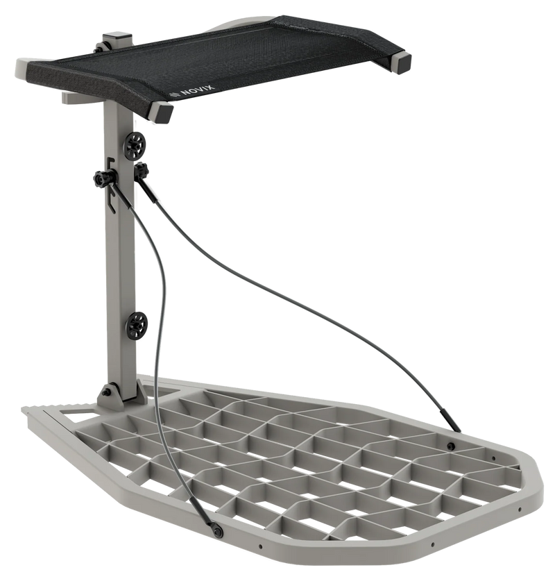 The Novix Raider is a hang-on treestand constructed from aluminum, measuring 31.8" L x 22.3" W x 5.4" H. Designed for hunters who prefer a lightweight, durable platform that can be hung on trees for elevated hunting positions. The aluminum construction provides corrosion resistance and reliable support for extended hunting sessions.