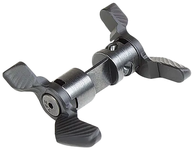 Ambidextrous modular safety designed for AR-15 platform rifles. Constructed from aluminum with a black finish. Dimensions: 5.6" length x 4.2" width x 0.4" height.