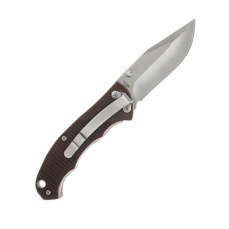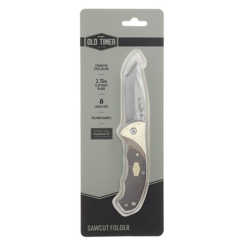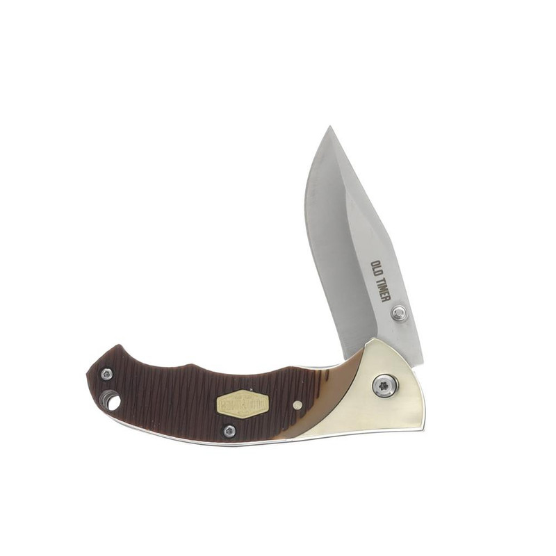 This Old Timer folding knife features a 2.75-inch clip point stainless steel blade and brown polymer handle in a compact 6.6-inch overall length, suitable for everyday carry and light outdoor tasks. The knife employs a traditional slip joint mechanism with a liner lock design for secure blade retention. Built in the USA by Battenfeld Knives, it combines durable stainless steel construction with a resilient polymer handle for reliable performance.