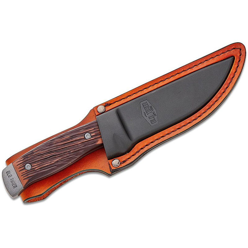 The Old Timer Frontier is a 5" drop-point fixed blade knife featuring corrosion-resistant 7Cr17 steel and a full tang construction for durability. It has a Luxewood composite handle with brown coloring and comes with a leather/molded synthetic sheath, measuring 9.8" overall.