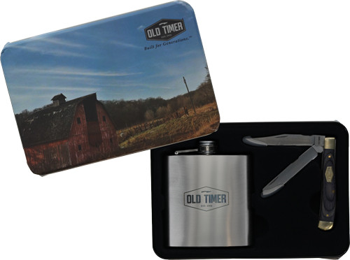 Old Timer two-blade folding knife paired with a flask in a promotional combo package. This classic folding knife features reliable blade performance suitable for general outdoor use and everyday carry.