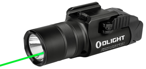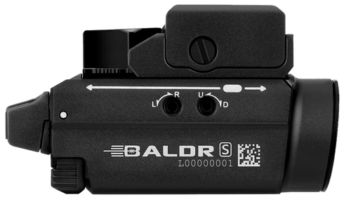 The Olight Baldr S is a rechargeable weapon-mounted light featuring 800 lumens output with a 130-meter beam distance and integrated blue laser. It mounts directly to Picatinny rails and is designed for slide-mounted or handgun applications. The light weighs 3.35 oz and measures 5.7" in length.