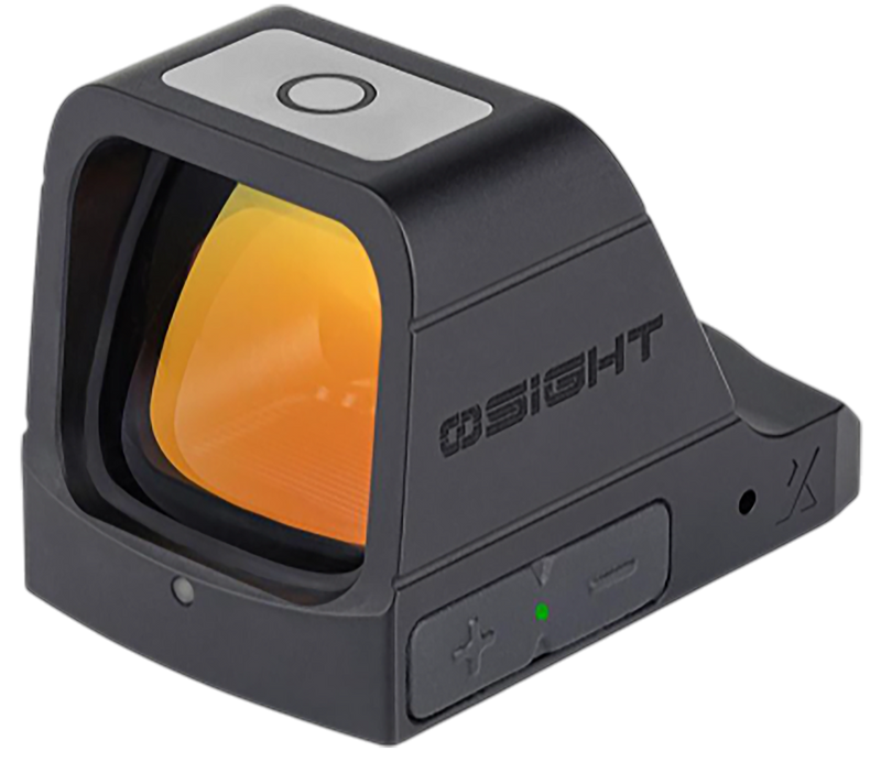 The Osight X is a 1x fixed magnification red dot sight featuring a 3 MOA red dot with 32 MOA circle reticle. It offers unlimited eye relief, water and weatherproof construction, and features a rechargeable battery with included charging cover and adjustment tool. The sight is designed with RMR footprint compatibility and includes a multi-reticle system for versatile aiming options.