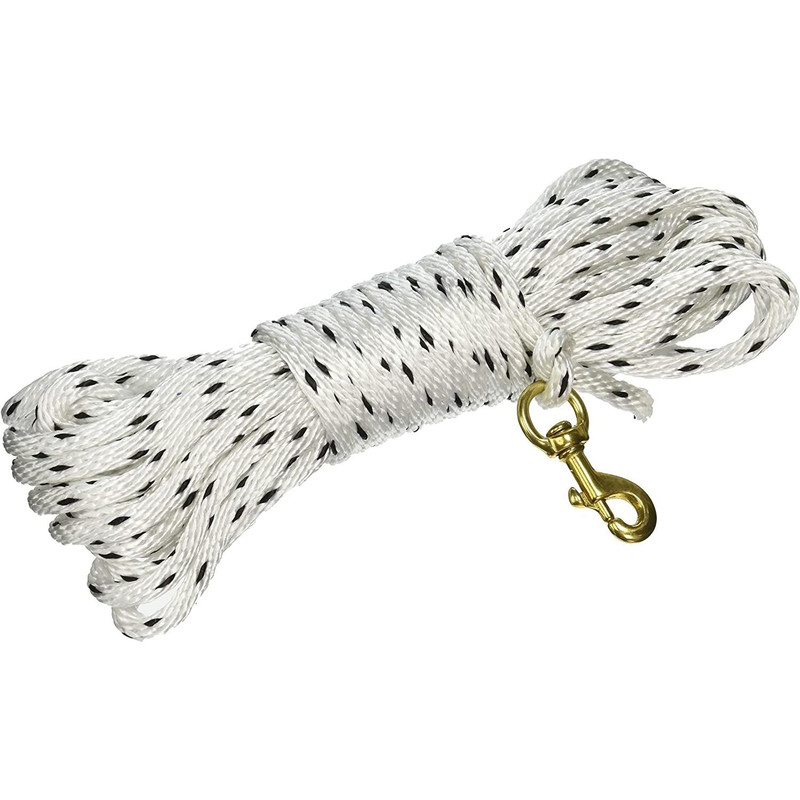 A 40-foot dog training leash made of tough 3/8" solid core rope with a solid brass snap designed for long-term durability and repeated use. Ideal for dog training and control at distance. The brass snap provides secure attachment and years of reliable performance.