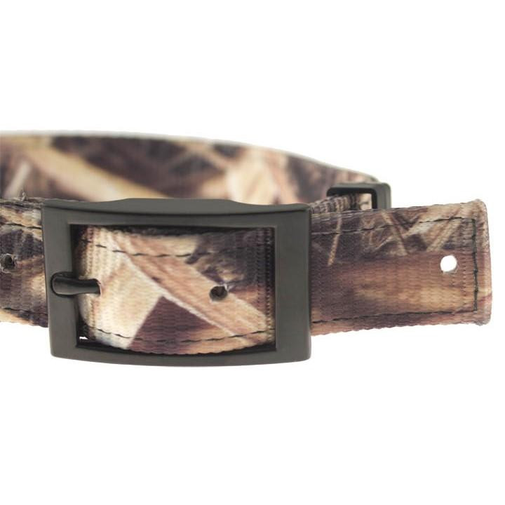 Adjustable dog collar featuring 2-ply nylon construction with sturdy black hardware and a tip tab that secures the collar in place. Fits neck sizes from 18 to 26 inches with a 1-inch width. Available in Mossy Oak Shadow Grass Blades camouflage pattern.