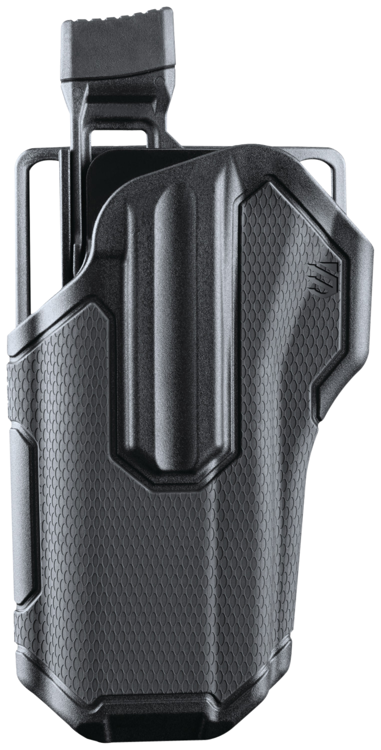 The Blackhawk Omnivore is a multi-fit holster accommodating over 150 semi-automatic handgun styles with an accessory rail. It features an active retention mechanism that locks onto Blackhawk's proprietary Rail Attachment Device rather than the firearm frame, with a thumb release for quick access. This non-light bearing model comes as an outside waistband belt slide holster in black with a textured finish.