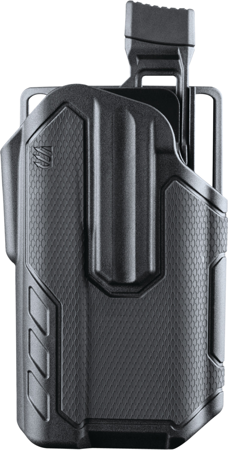 The Blackhawk Omnivore L2 is a multi-fit outside waistband holster that accommodates more than 150 styles of semi-automatic handguns equipped with SureFire X300/X300U-A tactical lights. It features a thumb-activated Level 2 active retention mechanism that locks onto the light rather than the firearm frame, and includes a proprietary Rail Attachment Device for secure mounting. The right-hand carry holster is constructed from durable polymer with a textured matte finish.